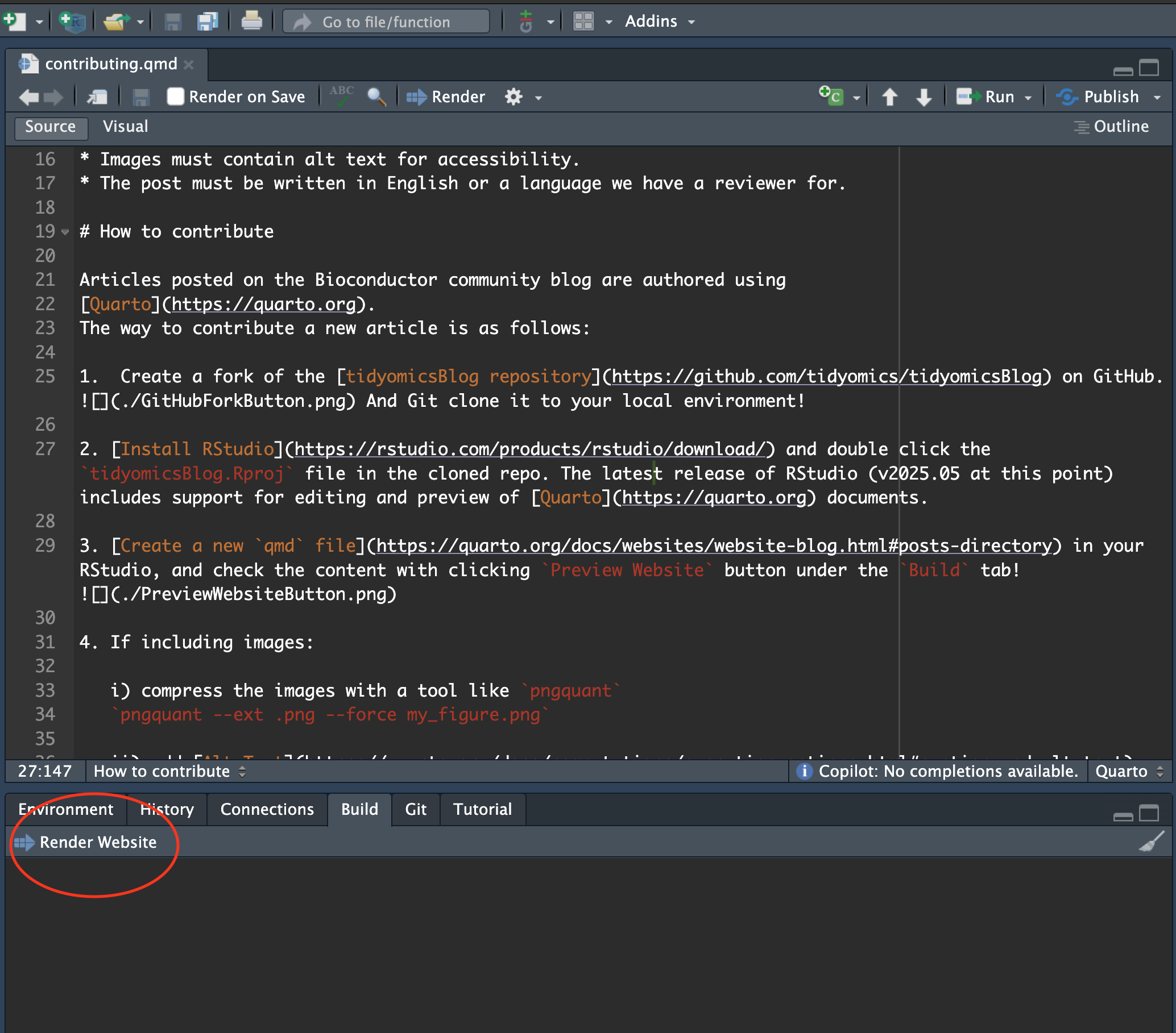 Articles posted on the tidyomics community blog are authored using Quarto. The way to contribute a new article is as follows: